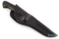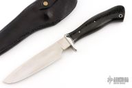 This knife by Sean McWilliams features a drop point forged stainless steel blade with a satin finish and false top edge, .231" blade stock and 1.204" blade depth, hidden tang construction. The handle has a stainless steel guard and a black linen micarta grip with black and stainless steel spacers. Comes with a hand tooled black leather sheath. Excellent condition.