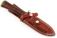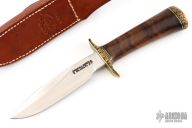 This Combat Companion by Randall Made Knives features a satin finished blade with sharpened top edge, .223" blade stock and 1.086" blade depth, 3" sharpened top edge, hidden tang construction. The handle has an engraved brass double guard and butt, black/brass spacers, wood grip. Includes a brown leather sheath. Excellent condition. Guard is signed "DP56"