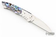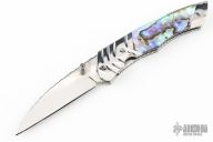 This linerlock by John Thita features a mirror polished blade with single thumb stud with abalone inlay. The handle has polished and fileworked stainless steel bolsters with abalone scales, fileworked stainless steel liners and backspacer. Has some light scratches, otherwise excellent condition.