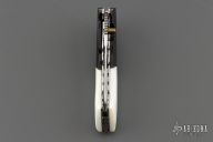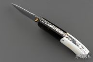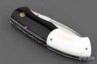 This linerlock by John Thita features a mirror polished blade with single thumb stud and a fileworked spine. The handle has buffalo horn bolsters, mother of pearl scales, fileworked stainless steel liners and backspacer. Excellent condition.