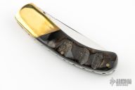 This linerlock by John Thita features a mirror polished blade with single thumb stud and a fileworked spine. The handle has brass bolsters, buffalo horn scales, stainless steel liners and fileworked backspacer. Excellent condition.