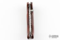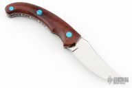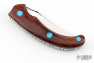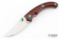 This linerlock by John Thita features a mirror polished blade with single thumb stud and a fileworked spine. The handle has wood scales with turquoise inlays, fileworked stainless steel liners and backspacer. Excellent condition.