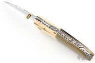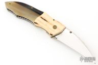 This linerlock by John Thita features a satin finished blade with single thumb stud and fileworked spine. The handle has stag bolsters , honey horn scales, fileworked stainless steel liners and backspacer. Excellent condition.