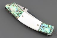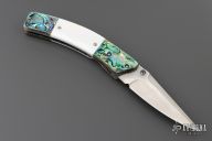 This linerlock by John Thita features a satin finished blade with single thumb stud and fileworked spine. The handle has abalone bolsters, mother of pearl scales, fileworked stainless steel liners and backspacer. Excellent condition.