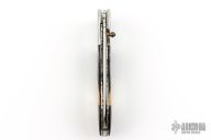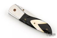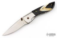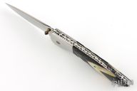 This linerlock by John Thita features a mirror finished blade with single thumb stud and fileworked spine. The handle has stainless steel bolsters, carved buffalo horn scales with gold lip pearl inlays, fileworked stainless steel liners and backspacer. Has a couple light scratches, otherwise excellent condition.