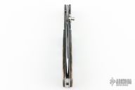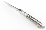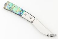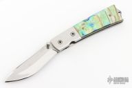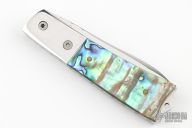 This linerlock by John Thita features a mirror finished blade with single thumb stud and fileworked spine. The handle has stainless steel bolsters, abalone scales, stainless steel liners and fileworked backspacer. Has a couple light scratches, otherwise excellent condition.