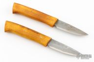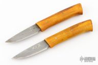 This pair of knife feature San Mai Damascus blades with .140" blade stock and .775" blade depth, full tang construction with wood grips. They have a few light scuffs and a little patina, otherwise excellent condition. Please let us know if you recognize this makers mark.
