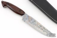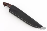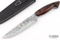 This Knife features a San Mai Damascus blades with dimpled flats, .165" blade stock and 1.354" blade depth, full tang construction. The handle has desert ironwood scales with black liners. Comes with a black leather sheath. Excellent condition. Please let us know if you recognize this makers mark.