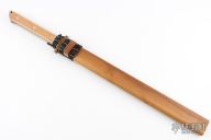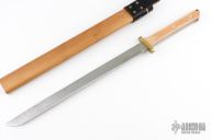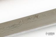 This wakizashi has a makers mark we don't recognize, please let us know if you do, Google said it translates to "ALSO OFTEN", which i doubt is correct. It has a San Mai Damascus blade with .256" blade stock and 1.318" blade depth, hidden/frame tang construction. The handle has a brass guard, checkered maple wood scales and a steel frame. Comes with a wooden saya with leather belt loop. Has some light scuffs and some oxidation on the tang, otherwise good condition.
