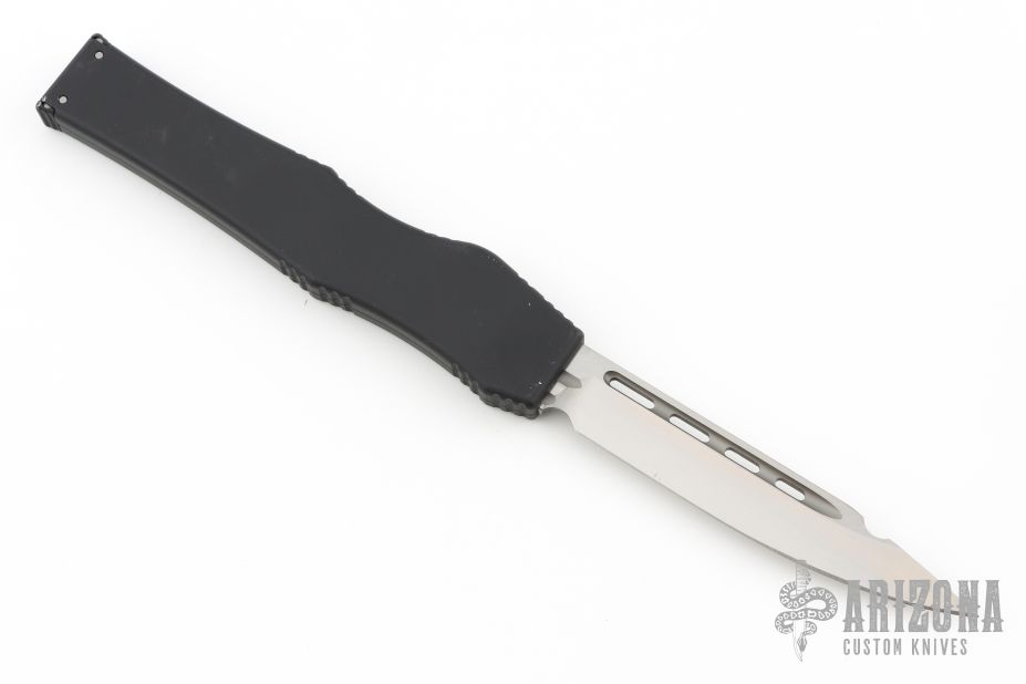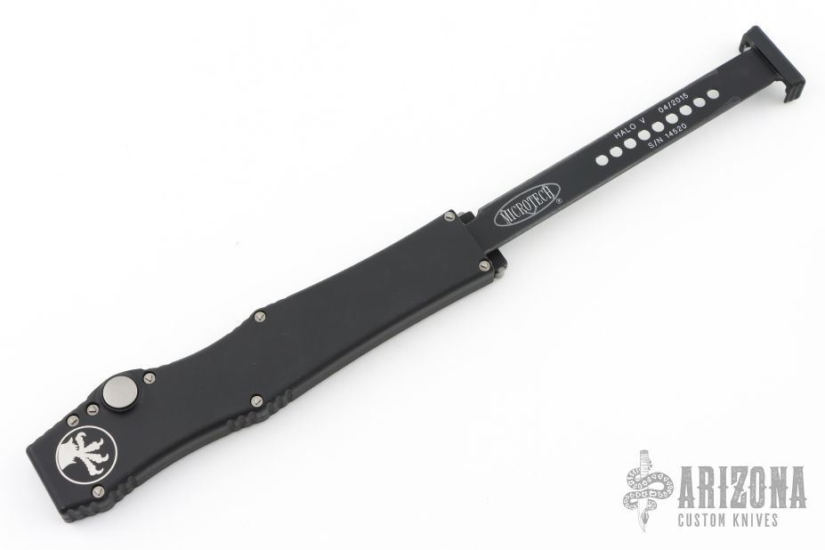 This Halo V OTF automatic has a satin finished drop point blade with a standard edge and a black aluminum frame. Dated 04/2015 and S/N 14520. Light scratches on the blade. Has a few dings on the handle otherwise the knife is in good condition.  Includes a padded zippered case.