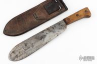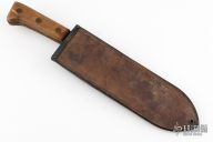 Broad, non-tapering chopping blade swelling towards the point, with round tip and false edge, 11 3/8 inches long, 16½ inches overall. Thick wood scale grips secured by three brass rivets to the exposed tang. Brown leather scabbard with brass throat piece, webbing hooks and grommet hole at the chape. Sheath is stamped "USMC BOYT 43" on the back.