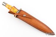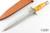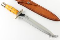 This beautiful dagger by Harold Corby features a mirror polished blade with .274" blade stock and 1.544" blade depth, hidden tang construction. The handle has a nickel silver guard and butt, stacked amber grip with nickel silver spacers. This is a stunning example of Corby's outstanding craftsmanship. Comes with padded zippered case and a brown leather sheath. Excellent condition.