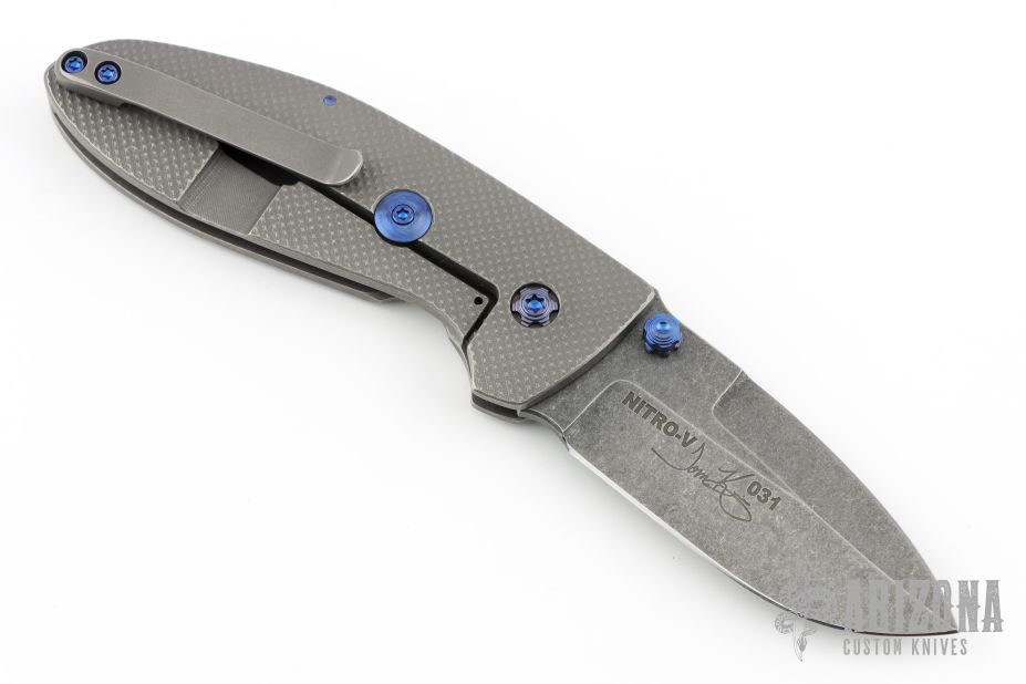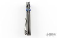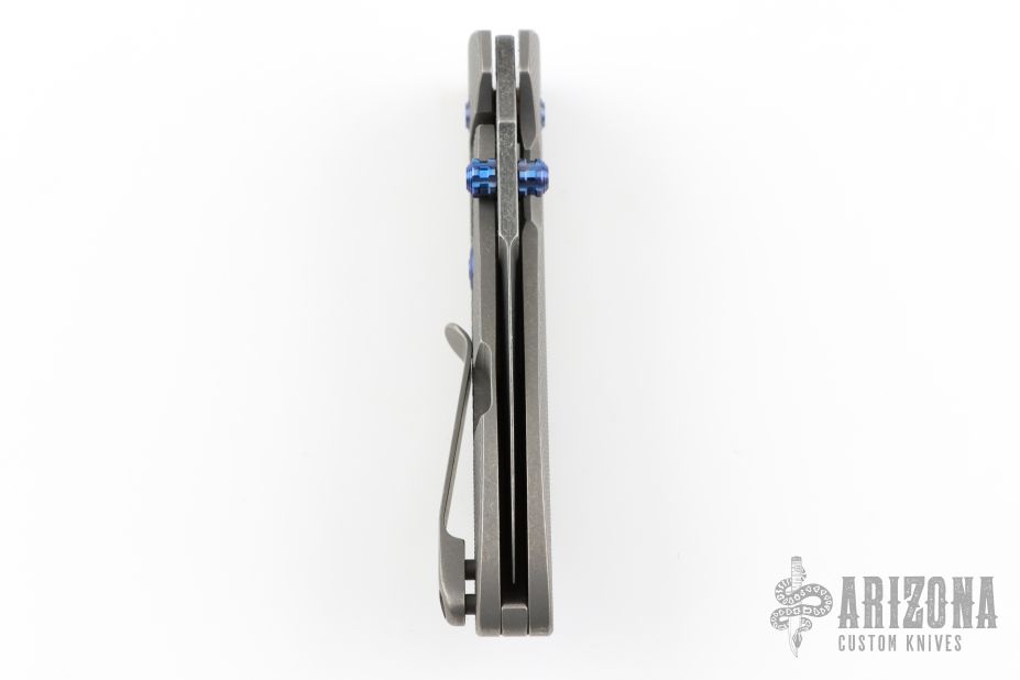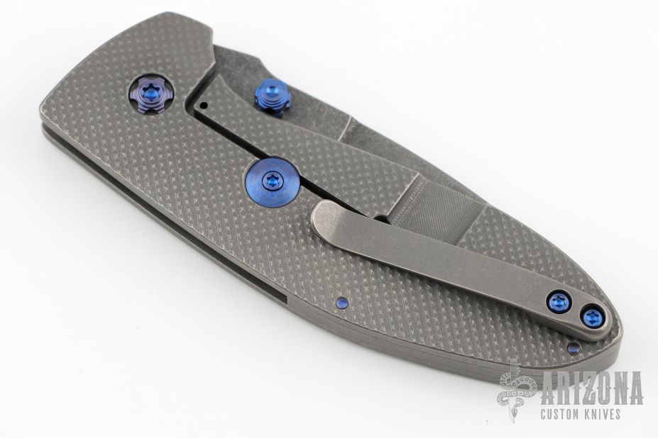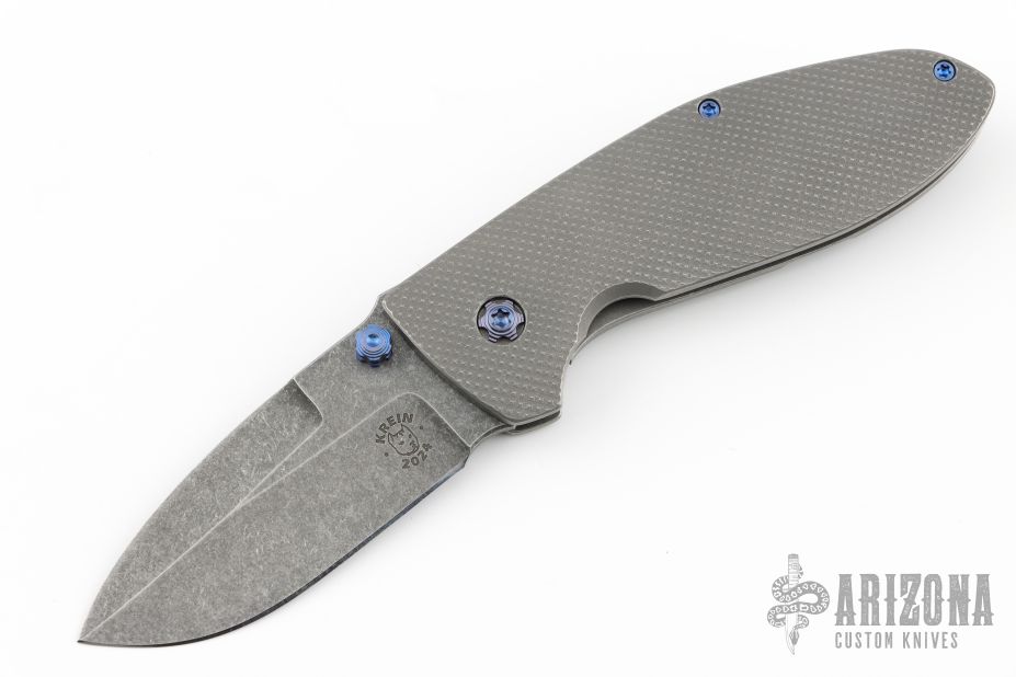This Alpha by Tom Krein features an acid wash finished drop point blade with dual thumbstuds and swedge. The handle has checkered titanium scales, tumbled tip up clip, matching titanium backspacer. Anodized hardware. Nice lock up, detent and blade seating. Includes a padded zippered case and COA #031. Excellent condition.