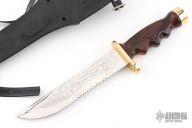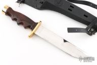This dive knife by Swimaster features a mirror polished partially serrated blade with false top edge, .191" blade stock and 1.343" blade depth, hidden tang construction. The handle has a brass guard and butt with a faux wood grip. Comes with original sheath. Has some light scratches, otherwise excellent condition.