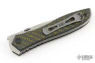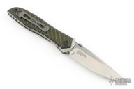 This knife by Zero Tolerance is an Emerson design. It features a two-tone blade with thumbdisc. The handle has green carbon fiber scales, stonewashed titanium frame and tip up titanium clip, left or right reversible. Excellent condition. s/n 3326