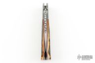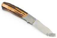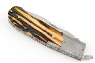 This Mid-Lock by W.D. Pease features a hand rub satin finished blade with nail nick and fileworked spine. The handle has Stainless Damascus bolsters, stag scales with red liners, stainless steel liners and fileworked lockbar/backspacer. Excellent condition. "36sm1" Comes with a zippered case and COA dated 11-2014