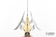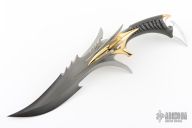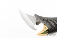 The Tiger Shark was the 2002 Gold edition in the annual "Hibben Fantasy Knife Series," designed by master knife maker Gil Hibben. It is a beautifully designed work of art produced using the finest grade materials and workmanship. Features include six uniquely designed stainless steel blades and solid metal handle parts. The fantasy style main blade (with false-edged top) bears the precision laser marked Hibben Knives logo and signature. This annual series is eagerly awaited by collectors each year and if you missed the 2002 Tiger Shark, this is your opportunity to complete your collection. United Cutlery, GH2015. Comes original box, papers and display stand. Excellent condition.