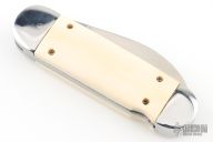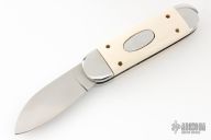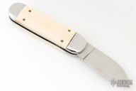 This automatic by Judy Gottage features a hand rub satin finished blade, it is marked "Judy Gottage Maker" on the blade. The handle has a mirror polished stainless steel frame and push button, mammoth ivory inlays, and a stainless steel spring and backspacer. Has some light scratches and a little blade play, excellent condition otherwise.