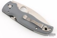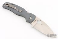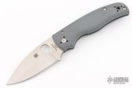 The new BladeOps Exclusive Spyderco Shaman features a gray G-10 handle, skeletonized stainless steel liners, a satin finshed leaf shaped ELMAX blade, and Spyderco's trademark round hole opening feature.