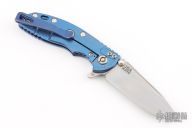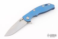 This 3" Slicer XM-18 flipper from Hinderer Knives has a stonewashed blade with notched thumbrest and flipper, no choil. The handle has a blue stonewashed titanium front scale, blue stonewashed titanium frame and deep carry clip. Reversible pocket clip. Strong lock up, nice detent and blade seating is center. Includes original box, extra bushings and papers. Comes with original Jade G-10 scale and anodized titanium liner, and original blue titanium clip. Excellent condition.