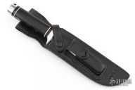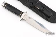 This Navy Seal Trident by SOG has a satin finished stainless steel clip point blade with false top edge, stainless guard and butt, and hidden tang. .274" blade stock, 1.184" depth. Handle has a stainless steel guard and butt with a stacked black paper micarta grip with white spacers. Comes with a original black leather sheath. Has a couple very light scratches, otherwise excellent condition.