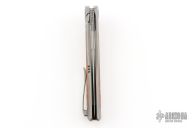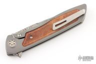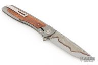 This Typhoon Framelock Flipper from Sharp By Design has a Baker Forge Tiger GoMai San Mai Damascus blade, notched thumb rest and flipper. The handle has a bead blasted titanium frame, vintage Bakelite inlays and a tianium tip up pocket clip, anodized titanium backspacer. Flips wonderfully. Excellent lockup and detent, with dead center blade seating. Beautiful piece. Comes with hard case with metal COA. Excellent Condition.   #0011