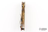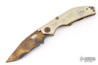 This DDC BBNM by Duane Dwyer features an SM-100 blade with thumbhole and heat treat colors. The handle has a magnesium front scale and flamed titanium lockside and tip up clip that is left/right reversible, bronzed screws and pivot. Nice detent, lockup and blade seating. Comes with velcro case and patch. Excellent condition. Comes with COA.