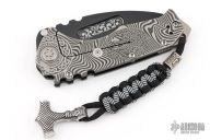 This Praetorian T frame lock folder by Medford Knives has a black PVD Tanto blade with dual thumb studs and engraved fullers. Handle has a laser engraved titanium frame with D2 backspacer and tip up titanium clip with . Titanium pivot. Blade is centered when closed, nice lockup and detent. This frame lock comes in the original box, hard case and paperwork dated August 24, 2021. Excellent condition. This knife was given the Full Engraving package by Alchemist EDC. Comes with original clip and screws, but it is not installed. Comes with custom Pacor and knife beads to match the design.