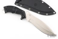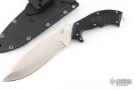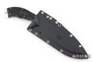 The FRN handle scales are Bi-Directionally Textured and grip the skin both coming and going. There are two lanyard holes: Blade lanyard is a smaller Spyderco Round Hole and allows a short thong through the tang keeping hand choked up high on the handle while swinging and chopping. Back handle lanyard accommodates a longer wrist thong and is elongated accepting a flat strap or thong. Jimping forward of the blade lanyard hole and inside the choil keeps the whole thing grippy in even smaller hands. Injection molded Fiberglass reinforced nylon (FRN) sheath with multi-position FRN G-Clip.