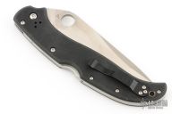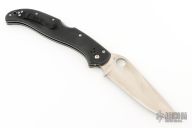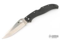 This Tatanka by Spyderco a satin finished blade with notched thumbrest and thumbhole. The handle has black G-10 scales with stainless liners and backspacer, 4-way reversible black stainless clip. Has a few light scuffs, otherwise excellent condition.