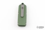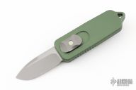 This OTF by Prometheus Design Werx, and Darriel Caston features a two-tone satin and bead blast blade with swedge. The handle is green aluminum with a tip down stainless steel clip. Comes with a zippered case. Excellent condition.