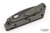 This Mick Strider SMF Fatty framelock folder features a black blade with thumbhole and notched thumbrest. The handle has a black aluminum and flame finished titanium frame with titanium clip, tip up carry. Jimping on blade spine. Nice lockup, detent, and blade seating. NSN: 1095-01-531-5015. Excellent condition.