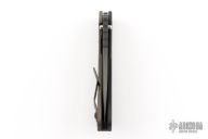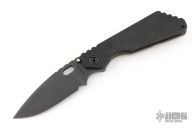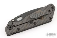 This Mick Strider SMF framelock folder features a black blade with thumbhole and notched thumbrest. The handle has a black aluminum and flame finished titanium frame with titanium clip, tip up carry. Jimping on blade spine. Nice lockup, detent, and blade seating. NSN: 1095-01-531-5015. Excellent condition.