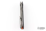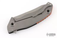 This folder by Poltergeist Works of Poland features a Wharcliffe stonewashed blade with notched thumb rest and flipper. Front scale is G10; Locking side is a bead blasted titanium. Blade is centered when closed, opens smoothly, and locks up with no play in any direction. Orange g10 backspacer. Comes with original box, and papers dated 7-10-2019. Excellent Condition.