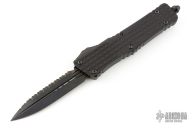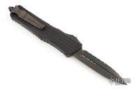 This Combat Troodon OTF automatic by Microtech knives features a fully serrated double edged DLC finished blade. The handle has a DLC frag pattern aluminum handle with black hardware, tip down carry. Glass breaker. Comes with original box and papers. New condition. #462