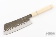 This Custom Nakiri by Ohlone Knives features satin finished bevels with hammer marked flats, .113" blade stock and 1.925" blade depth, hidden tang construction. The handle has an ivory paper micarta grip with nickel silver spacers. Comes with original box. New condition.