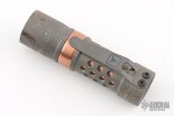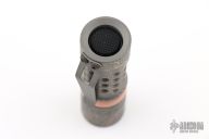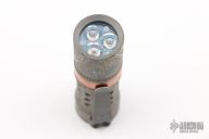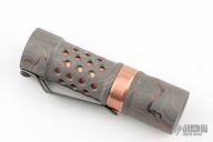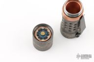 This classy light from The Barrel Flashlight Company features a titanium body, copper ring sleeve, and a titanium clip. From the makers site: Barrel Flashlight Co. flashlights are proudly made in USA. Our lights are turned from solid round bar. About 1000 lumens on high depending on LED’s selected Triple LED output with builds with Cree XP-L HI 5K. The “ pill “ that houses the LED’s and driver is machined from solid for optimum performance and heat transfer. Light measures 3.5 inches long and just under 1 inch in diameter. Light runs on an Efest high capacity 700mAh 16340 unprotected button top rechargeable IMR battery (not included). Interchangeable barrel rings, barrels ( inner sleeve), clips, and screws to customize your light and ability to match your EDC. Light is built with one of the most advanced drivers on the market: the fully programmable H17F with battery monitoring. The H17F comes in a very user friendly set default of moonlight, low, medium, and high. Rear “ clicky “ button cycles light through modes. For the avid flashlight hobbyists , a secret hidden mode can be entered to program the light. Light is water resistant. Light tailstands very well.