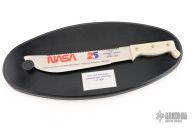 This exact replica of the original Astronaut's Survival Knife carried on manned space flights and used in survival training. The blade is made from CASE's Tru-Sharp surgical steel with a fine glazed finish, polished and honed edge, and a saw tooth blade back. This knife was Issued in year 1983 by the CASE KNIFE MANUFACTURING CO. to honor the accomplishments of the National Aeronautics and Space Administration during the first 25 years, and for continued success in the next 25 years. The handle is made of a white polypropylene. Three color artwork of the NASA 25th Anniversary Logo appears on the blade. An attractive black wall plaque is included for wall display. This special NASA Commemorative was manufactured in a limited edition of 1000 units. This knife is #0715.