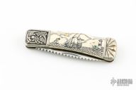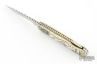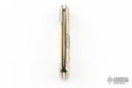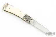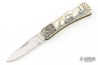 This lockback from Sam McDowell features a surgical steel mirror polished blade with fileworked spine and nail nick. The handle has engraved nickel silver bolsters with nice scrimshaw on the ivory paper micarta scales, nickel silver liners and fileworked stainless steel backspacer, has a lanyard bail. Signed "Sam McDowell 1996" and "Fairwinds and Following Seas Pacific Tweed" on the edges of the scales. Comes with a brown leather slip sheath. Has a couple light scratches, otherwise excellent condition.