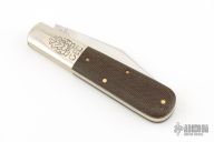 This Barlow from Great Eastern Cutlery features a satin finished clip point style blade with swedge. The handle has pinched and fluted nickel silver bolsters, micarta covers over brass liners and stainless steel spring. Has Half-stop. Comes with original tube and paper. Has some patina, otherwise Excellent condition.