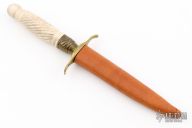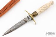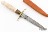 This Dagger features a double edge-blade with a barbwire finish and a hidden tang construction. .283" Blade Stock. .685" Blade Depth. The handle has a brass guard with a bone grip. Includes a brown leather sheath. Excellent Condition.