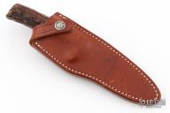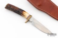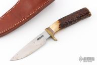 The Model 26 by Randall Made Knives is an excellent skinning and outdoors knife with drop point satin finished blade with .164" blade stock and .911" blade depth, hidden tang construction. The handle has a brass guard, stag grip and red/white/blue spacers, brass butt. Comes with brown leather sheath. Has some scratches and oxidation spots, has been resharpened, otherwise good condition.