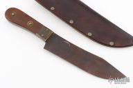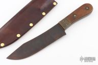 This Buffalo Hunter from Mike Mann and Idaho Blade Works features a black flat ground blade with .283" blade thickness and 1.670" blade depth, full tang construction. The handle has wood scales and inlaid brass bolsters and brass pins. Includes black leather sheath with belt loop. Has some scuffs and scratches, has a couple small oxidation spots, otherwise good condition.