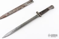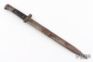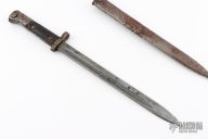 This is a Czech VZ-24 bayonet. It has a spear point blade with fullers, .205" blade stock and .894" blade depth, full tang construction. The ricasso is stamped "1 ZSC". Has a steel guard with "20113" stamped into it. Has wood scales. Has a steel butt/receiver that is also stamped "20113". The tang has some stamps, but I can't quite make them out. Comes with original scabbard with stampings on the belt clip, "CSZ E4 (a symbol) 37". Has scratches, rust and a blunted tip. Fair condition.