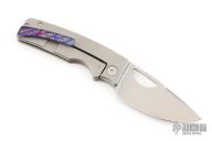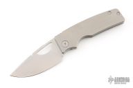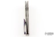 This knife by the OZ Machine Company features a tumbled Magnacut blade with thumbhole and notched thumbrest. The handle features a golf putter milled titanium frame with an aftermarket IMSS ZircuTi backspacer and tip up pocket clip with hidden screws. Includes box and papers dated 10-24-22 and s/n 1059. Listing also includes original backstrap and clip. Excellent condition.