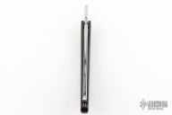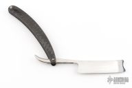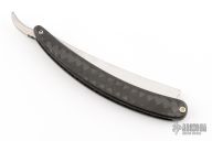 This Straight Razor by Sal Manaro features a high satin finished blade with notched finger rest, has a razor thin blade edge. The thickness of the blade behind the edge is .010". The handle is carbon fiber. Comes with a zippered case. Excellent condition.