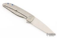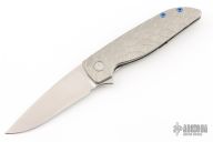 This Rask by John Grimsmo of Grimsmo Knives features a stonewash finished blade with notched flipper. The handle has a "Dragon Scale" milled 3.and tumbled titanium frame with matching tip up clip that has hidden screws, titanium barrel spacers and screws. Numbered #3046 on the spine of the blade. Includes original box and COA dated July 24, 2024. Excellent condition.