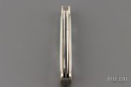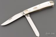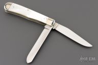 This Trapper by Case features 2 mirror polished blades with nail nicks. The handle has nickel silver bolsters, front and rear, mother of pearl covers, nickel silver liners, stainless steel springs. Comes with original box and papers. Excellent condition.