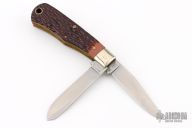 This Slipjoint from Camillus features two satin finished blades with nail nicks. The handle has nickel silver bolsters and jigged faux bone covers over brass liners and stainless steel springs. Excellent Condition. Comes with original box and papers.