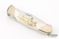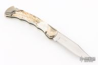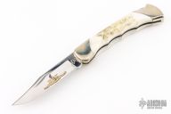This Custom BUCK 111 "Folding Hunter" has a beautiful elk horn inlays with a nickel silver frame. Mirror finished blade with nail nick. A must for any BUCK collection. Comes with original box, papers and sheath. Excellent condition. #1157/200 on the blade.